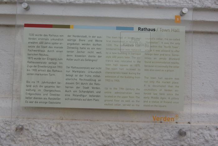 Rathaus 1330 wurde das Rathaus von Verden erstmals urkundlich erwähnt. 400 Jahre später ersetzte die Stadt das marode Fachwerkhaus durch einen barocken Neubau. 1875 wurde der Eingang zum Rathausvorplatz verlegt. Im Zuge der Erweiterung von 1903 bis 1905 erhielt das Rathaus seinen markanten Turm. Bis ins 19. Jahrhundert befand sich die gesamte Verwaltung im Obergeschoss. Erdgeschoss und Gewölbekeller dienten als Ratskeller. Es war die einzige Gaststätte der Norderstadt,in der auswärtige Biere und Weine angeboten werden durften. Zeitweilig hatte es ein renitenter Zecher nicht weit, denn biswejlen diente der Keller auch als Gefängnis! Der Rathausvorplatz war nicht nur Marktplatz. Urkundlich belegt ist der frühe mittelalterliche Rechtsvollzug an diesem Ort durch die Ratsherren der Stadt Verden. Auch ein Schandpfahl und eine Rolandfigur befanden sich einstmals auf dem Platz. Verden